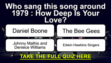 In this fun trivia quiz we're going to ask questions like "Who sang this song around 1979 : "How Deep Is Your Love"?" and "Who sang this song around 1977 : "Breaking Up Is Hard to Do"?".