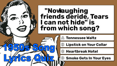 7/10 is what people on average are scoring in this 1950s Songs quiz so far. Are you ready to answer questions like "Who sang this song : "Unchained Melody" back in the 1960s?" and "Which 1965 hit contains this text : "I've hungered for your touch""