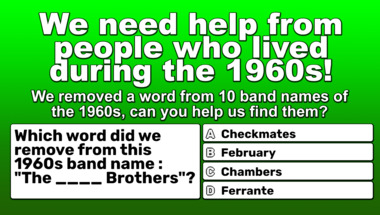 In this fun 1960s bands with a missing word quiz we're going to ask questions like "Which word did we remove from this 1960s band name : "____ Paul & Mary"?" and "Which word did we remove from this 1960s band name : "The ____ Circus"?".