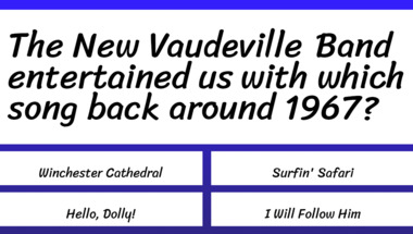 In this fun 1960s Songs quiz we're going to ask questions like "The Drifters entertained us with which song back around 1960?" and "The New Vaudeville Band entertained us with which song back around 1967?".