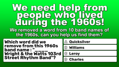 5/10 is the score to beat in this 1960s bands with a missing word quiz to put yourself over the average quiz taker. But you're probably going to be able to answer questions "Which word did we remove from this 1960s band name : "The ____ 5"?" and "Which word did we remove from this 1960s band name : "J. Frank Wilson & the ____".." easy!
