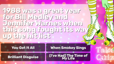 If you can answer "1988 was a great year for Bill Medley and Jennifer Warnes when this song fought its w.." and maybe even "The hit lists of 1986 contained this song from REO Speedwagon" there is a good chance that you're going to beat the average score of 6/10 in this 1980s Hits quiz