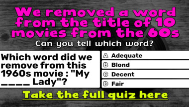 6/10 is what people on average are scoring in this trivia quiz so far. Are you ready to answer questions like "Which word did we remove from this 1960s movie : "The ____ of Music"?" and "Which word did we remove from this 1960s movie : "My ____ Lady"?"