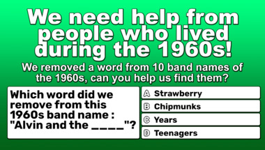 In this fun 1960s bands with a missing word quiz we're going to ask questions like "Which word did we remove from this 1960s band name : "The Everly ____"?" and "Which word did we remove from this 1960s band name : "Alvin and the ____"?".